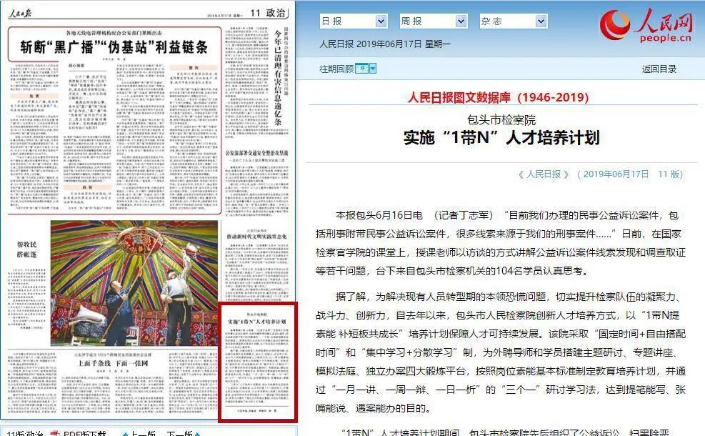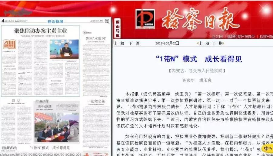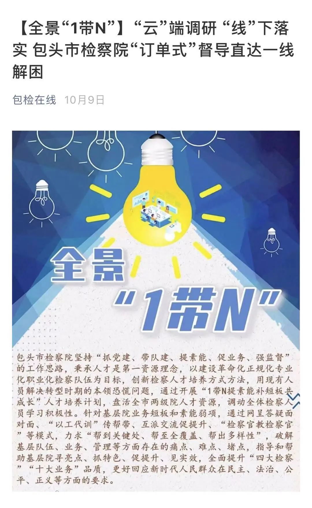 包头市检察机关将“1带N”人才培养工作作为解决基层工作的钥匙,与基层院建设工作有机结合,通过对口条线纵向指导、各基层院横向借鉴、领导班子具体抓推进的形式,充分融汇三方力量,达到众人划桨开大船的效果,包头人才培养工作已经走上良性发展轨道。