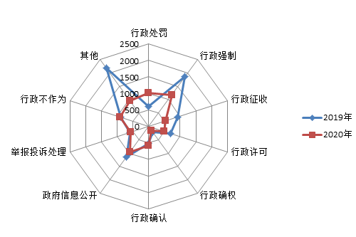 2020年的行政应诉案件量明显下降,与2019年相比,降幅达25.8%。