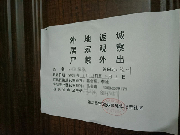 近日新华社客户端“全民拍”收到了这样一条线索:从温州返回鸡西过年的任福燊,在返乡前电话咨询目的地社区得知不需隔离,带着核酸检测阴性结果回家,却被“封”在家里严禁外出。鸡西市鸡冠区幸福里社区说这是当地政策。