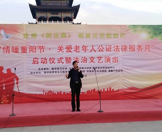 一、公证零距离,服务老年人。各公证处结合自身实际开展形式多样的公证服务活动。10月21日,嘉祥县司法局组织县公证处,在曾子广场以“走进《民法典》?迎接法治新时代”为主题,举行了情暖重阳节?关爱老年人公证法律服务月启动仪式暨法治文艺演出活动,为到场的老年人详细讲解遗嘱、遗赠扶养协议、赡养协议、委托、意定监护等保护老年人权益的公证事项,旨在指导老年人依法维护自己的合法权益,让老年人切实感受到公证法律服务的温度。