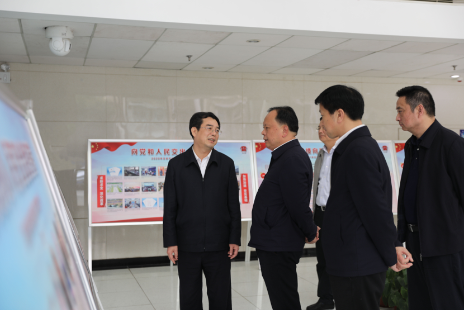 ▲周农(左二)等一行在省司法厅办公楼观看展板了解全省司法行政系统工作情况,范运田(左一)作解说。