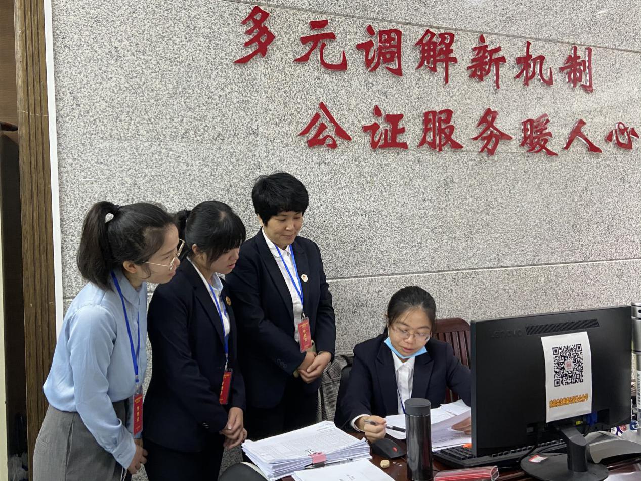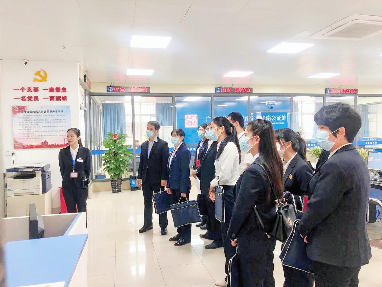 在开班第一天,学员们参观了桂南公证处的办证接待大厅和家事部、知识产权部的办公场所,听取了桂南公证处陈孝才主任对桂南公证处的发展历程、质量管控、业务拓展等方面的情况介绍。在之后的培训过程中,学员们分成4个学习小组,分批次先后到南宁市桂南公证处及桂南公证处驻南宁市青秀区人民法院、驻南宁市兴宁区人民法院司法辅助中心以实战的方式开展跟班培训。学员们从公证办理的申请、受理、审查、出证、归档等基本环节全流程跟进;对继承、委托、保全、司法辅助等业务的实际操作进行全方位学习,达到了相互交流、分享经验,共同提高的目的,取得了较好的成效。