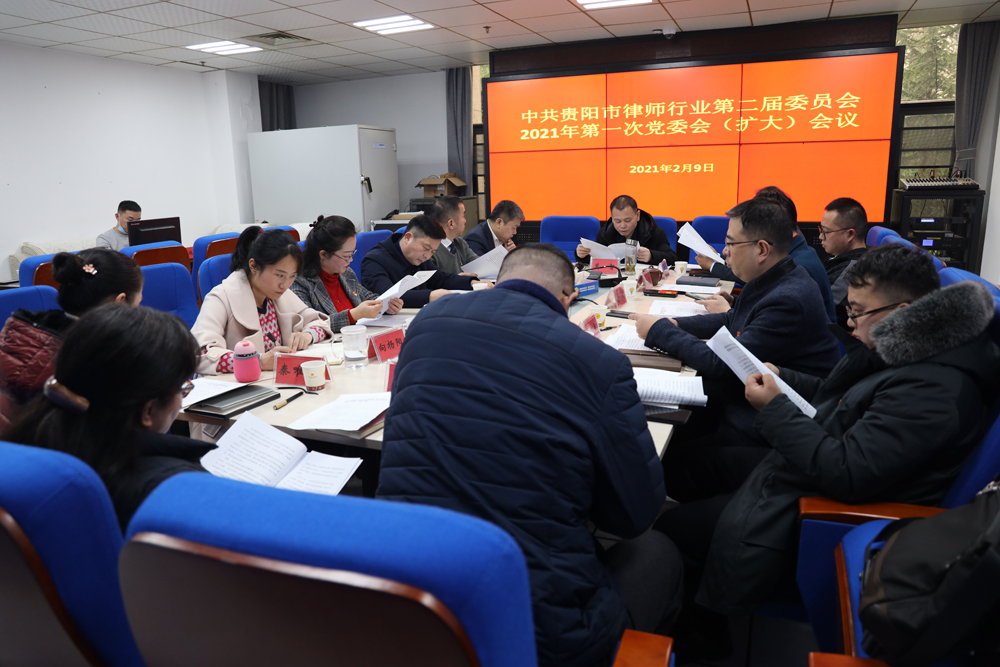 2月9日,贵阳市律师行业党委召开2021年第一次(扩大)会议,集中传达学习习近平总书记视察贵州重要讲话精神。会议由市司法局党委委员、副局长、市律师行业党委书记莫智主持。市律师行业党委副书记、市律协会长薛军,市司法局律师工作处处长、市律师行业党委副书记胡亮,市律师行业党委委员、市律协副会长朱皖昱、李俊、归东、周鑫,市律师行业党委委员尹咏梅出席会议。市律协监事会主席李永年、市律协秘书长向杨阳、市律师行业党委办公室主任朱小波以及市司法局律师工作处全体人员列席会议。
