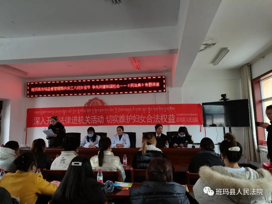 妇女是社会物质文明和精神文明的创造者,在“三八”国际妇女节之际,班玛县人民法院综合审判庭法官姚占莲向市场监督管理局干部及全县个体工商户们送去“特殊的节日礼物”,向她们普及《民法典·婚姻家庭法编》相关法律知识。