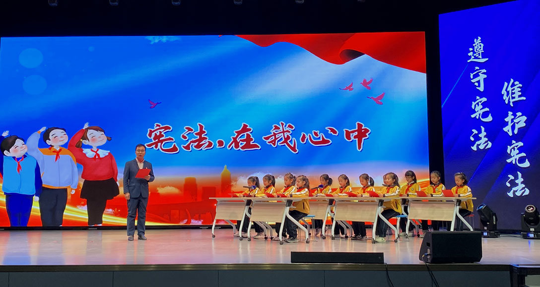 西宁市行知小学学生代表表演宪法晨读情景剧