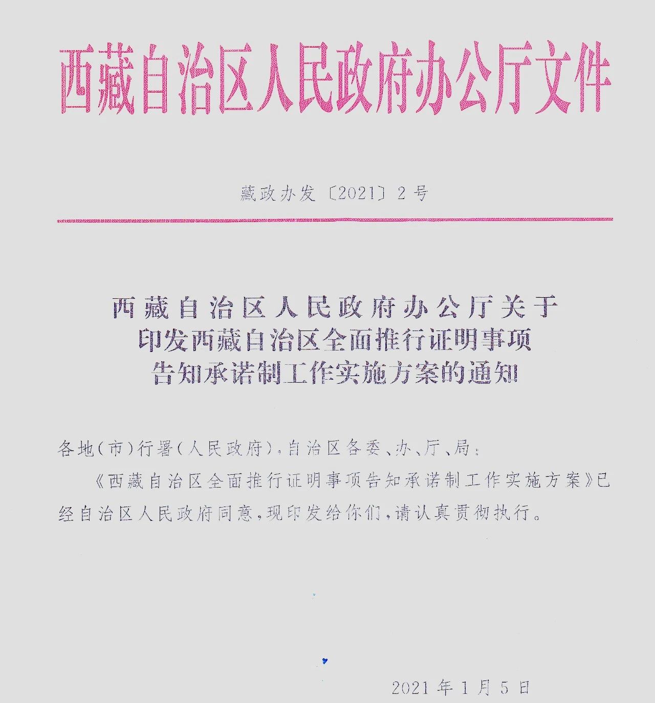 为认真贯彻落实党中央、国务院和自治区党委、政府关于持续开展“减证便民”行动和深化“证照分离”改革重大决策部署,进一步深化“放管服”改革,优化营商环境,激发市场主体发展活力和社会创造力,扎实做好“六稳”工作,全面落实“六保”任务。近日,西藏自治区人民政府办公厅印发《西藏自治区全面推行证明事项告知承诺制工作实施方案》(以下简称《实施方案》),在全区推行证明事项告知承诺制。