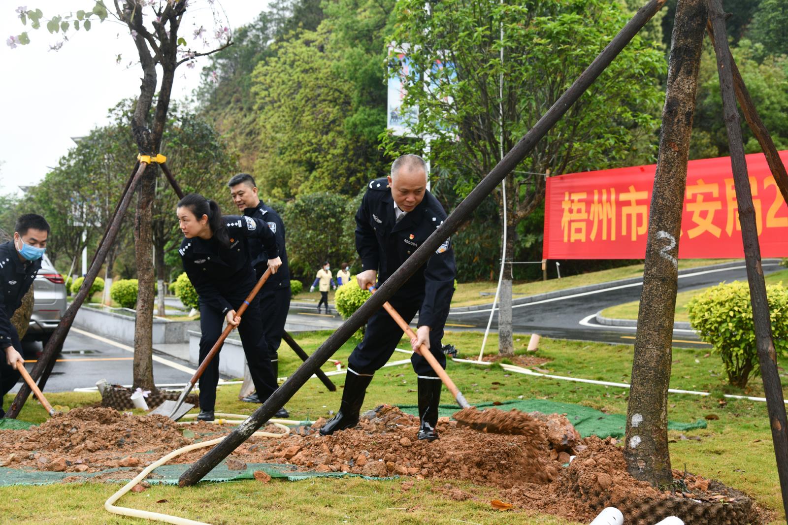 活动现场中,各党员民警拿起铁锹,扶好树苗,精心的完成着从挖坑、放树、填土、踩实到最后浇水的每一个步骤。民警们齐心协力,配合默契,干劲十足。经过大家辛勤地劳动,一棵棵树苗扎根沃土,在风中舒展枝叶,尽现勃勃生机。