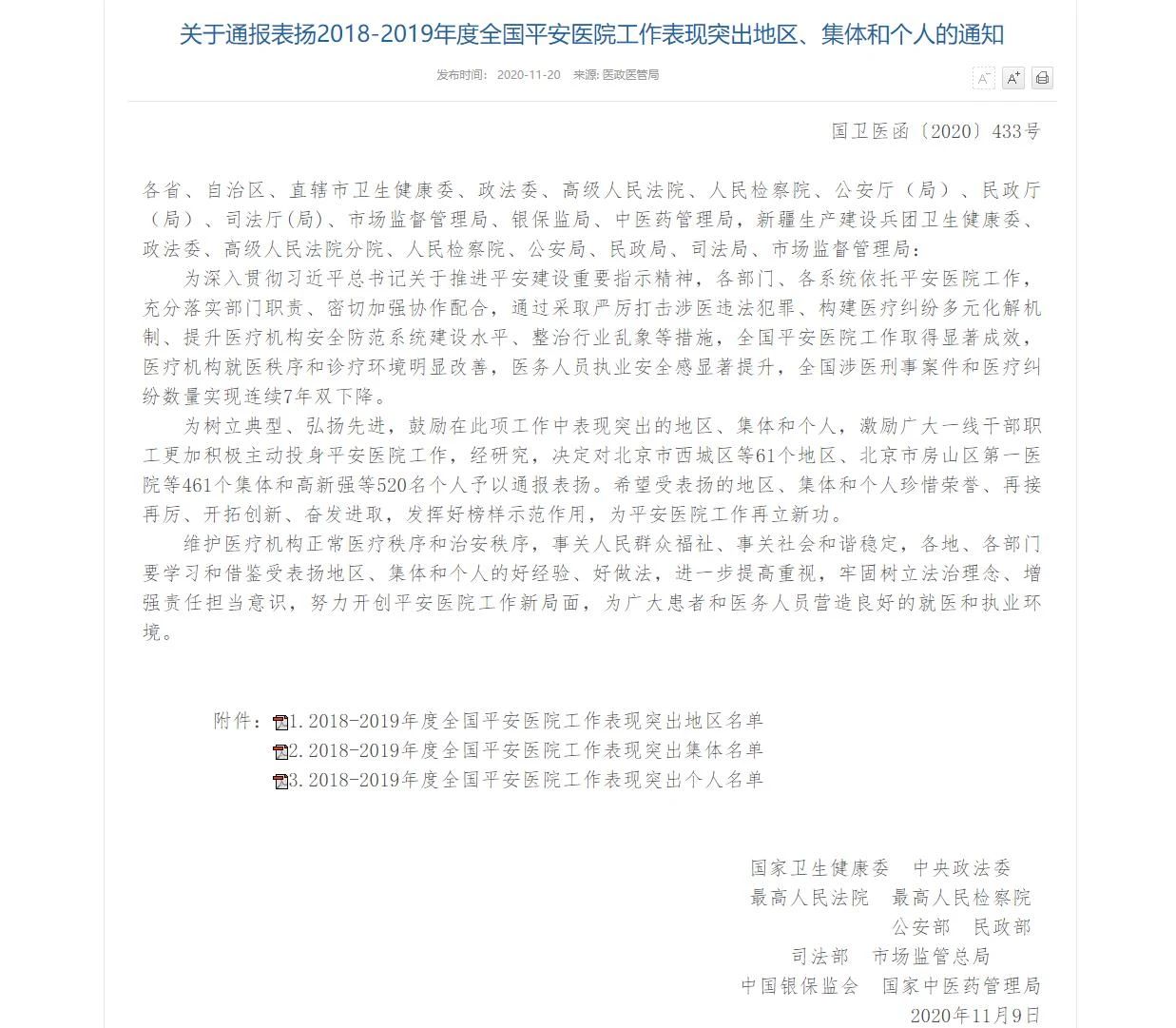 为树立典型、弘扬先进,鼓励一线干部职工更加积极主动投身平安医院创建工作,近日,国家卫生健康委员会、中央政法委、最高人民法院、最高人民检察院、公安部、司法部、市场监管总局、中国银保监会、国家中医药管理局联合发布《关于通报表扬2018—2019年度全国平安医院工作表现突出地区、集体和个人的通知》,我区基层司法行政机关和人民调解委员会、人民调解员榜上有名。