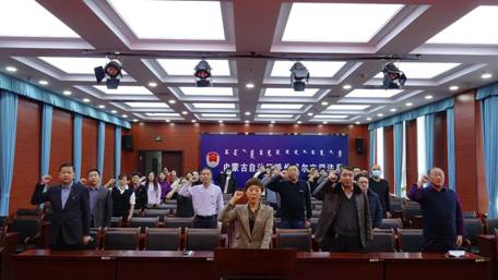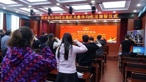 12月4日,呼伦贝尔市司法局举行向宪法集体宣誓仪式。宣誓地点局机关一楼会议室庄严肃穆,大屏幕上显示着宪法宣誓誓词。