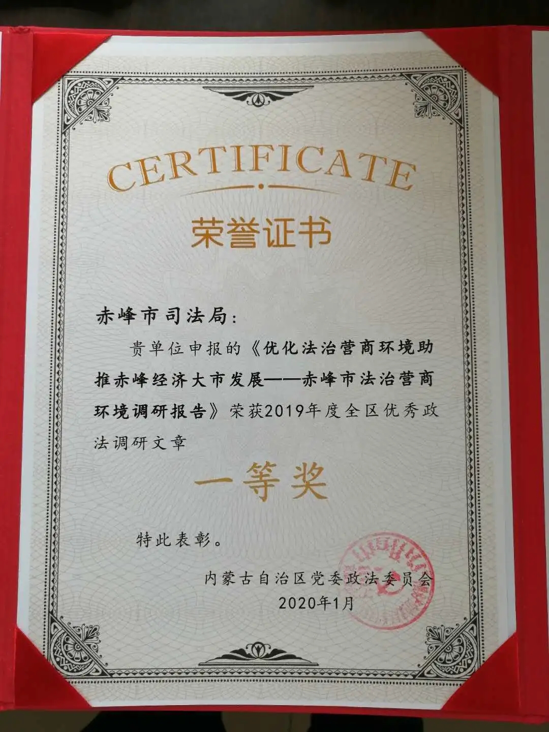 赤峰市法治营商环境调研报告被自治区党委政法委表彰为“全区优秀政法调研文章一等奖”