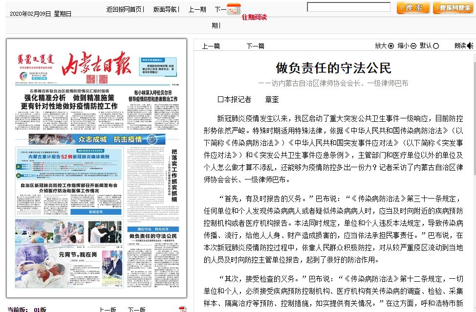 2020年2月9日,自治区律师协会巴布会长应邀接受了内蒙古日报《做负责的守法公民》栏目记者的采访,巴布会长针对目前疫情防控形势严峻,疫情防控工作中出现的哄抬防疫用品和民生商品价格、抗拒疫情防控、制假售假、造谣传谣等违法犯罪行为中的法律问题,依据相关法律法规进行了解读。