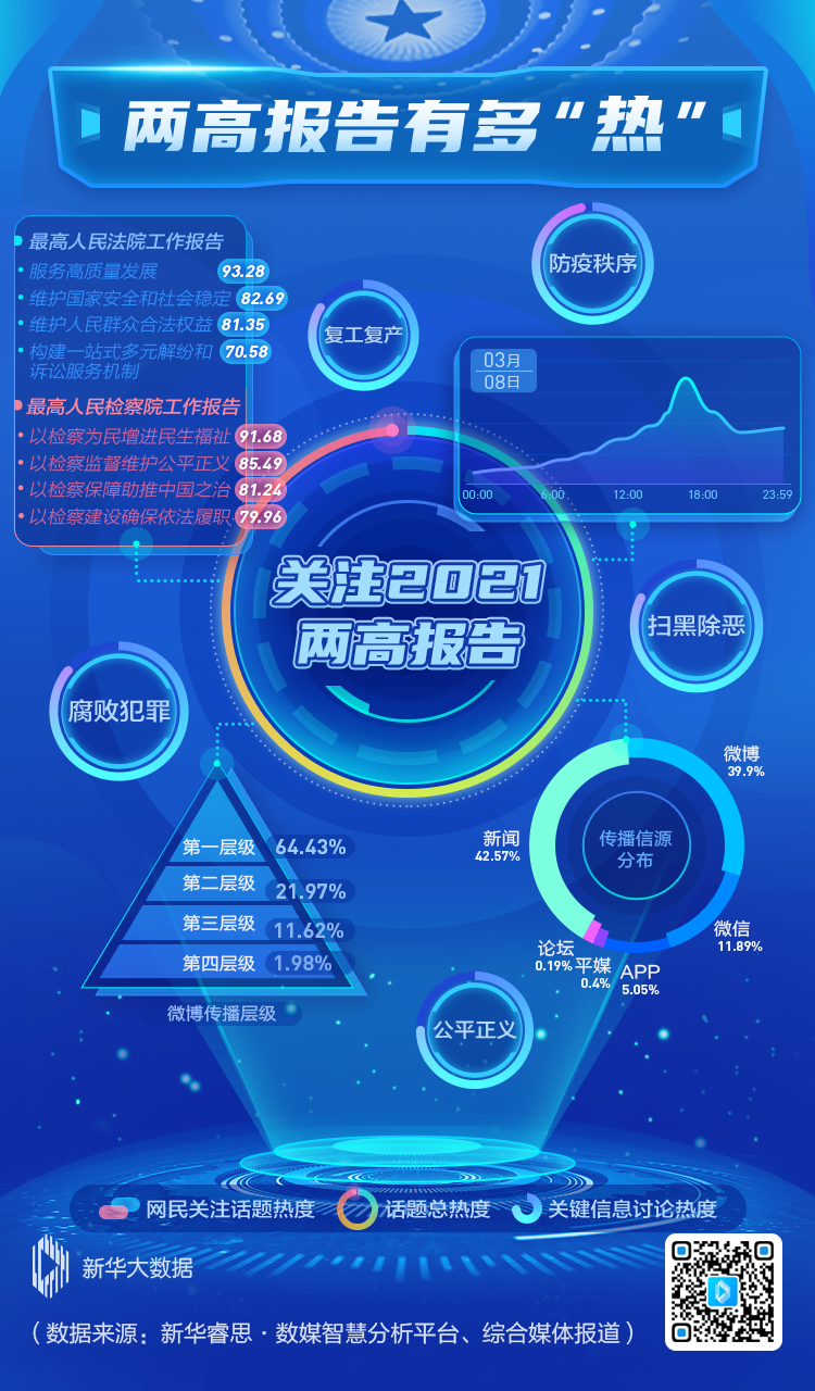 新华睿思数据显示,3月8日,与两高报告有关的信息量持续上升,至下午4时达到峰值。其中新闻信息最多,占比为42.57%。主流媒体围绕“两高”报告进行多媒体多角度的客观报道和评论解读被大量转载传播。