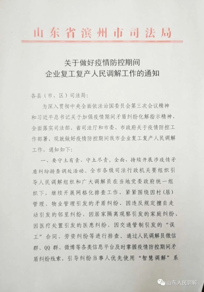 为深入贯彻中央全面依法治国委员会第三次会议精神和习近平总书记关于加强疫情期间矛盾纠纷化解指示精神,滨州市司法局针对目前全市疫情防控形势和企业复产复工现状,对做好疫情防控期间企业复工复产人民调解工作做出部署: