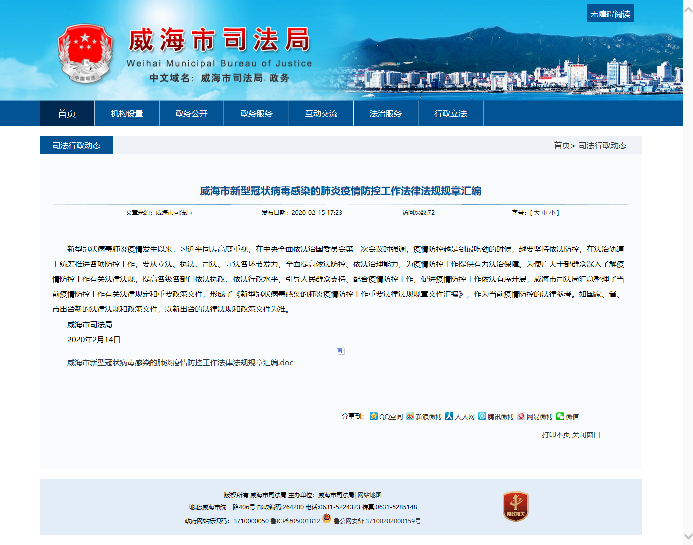 为使广大干部群众深入了解疫情防控工作有关法律法规,提高各级各部门依法执政、依法行政水平,引导人民群众支持、配合疫情防控工作,促进疫情防控工作依法有序开展,威海市委全面依法治市委员会办公室、威海市司法局汇总整理当前疫情防控工作有关法律规定和重要政策文件,形成《新型冠状病毒感染的肺炎疫情防控工作重要法律法规规章文件汇编》,作为当前疫情防控的法律参考。如国家、省、市出台新的法律法规和政策文件,以新出台的法律法规和政策文件为准。