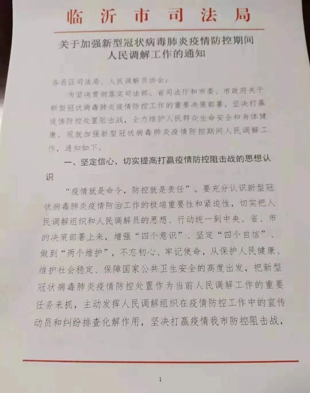 为坚决贯彻落实司法部、省司法厅和市委市政府关于新型冠状病毒感染的肺炎疫情防控工作的重要决策部署,坚决打赢疫情防控阻击战,全力维护疫情防控工作期间的社会和谐稳定,临沂市司法局印发《关于加强新型冠状病毒肺炎疫情防控期间人民调解工作的通知》,有针对性地部署安排加强疫情防控期间人民调解工作。