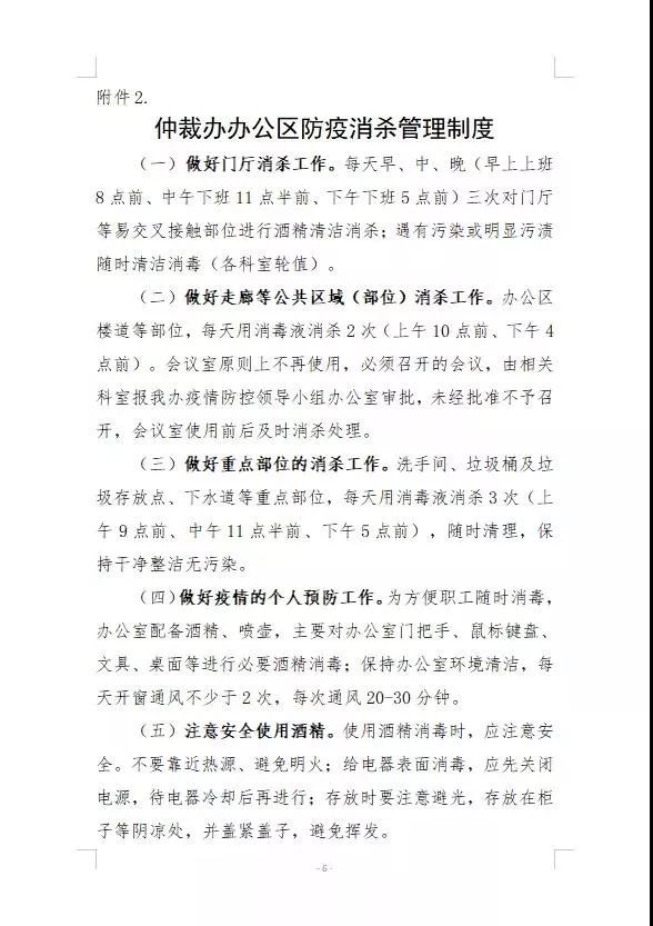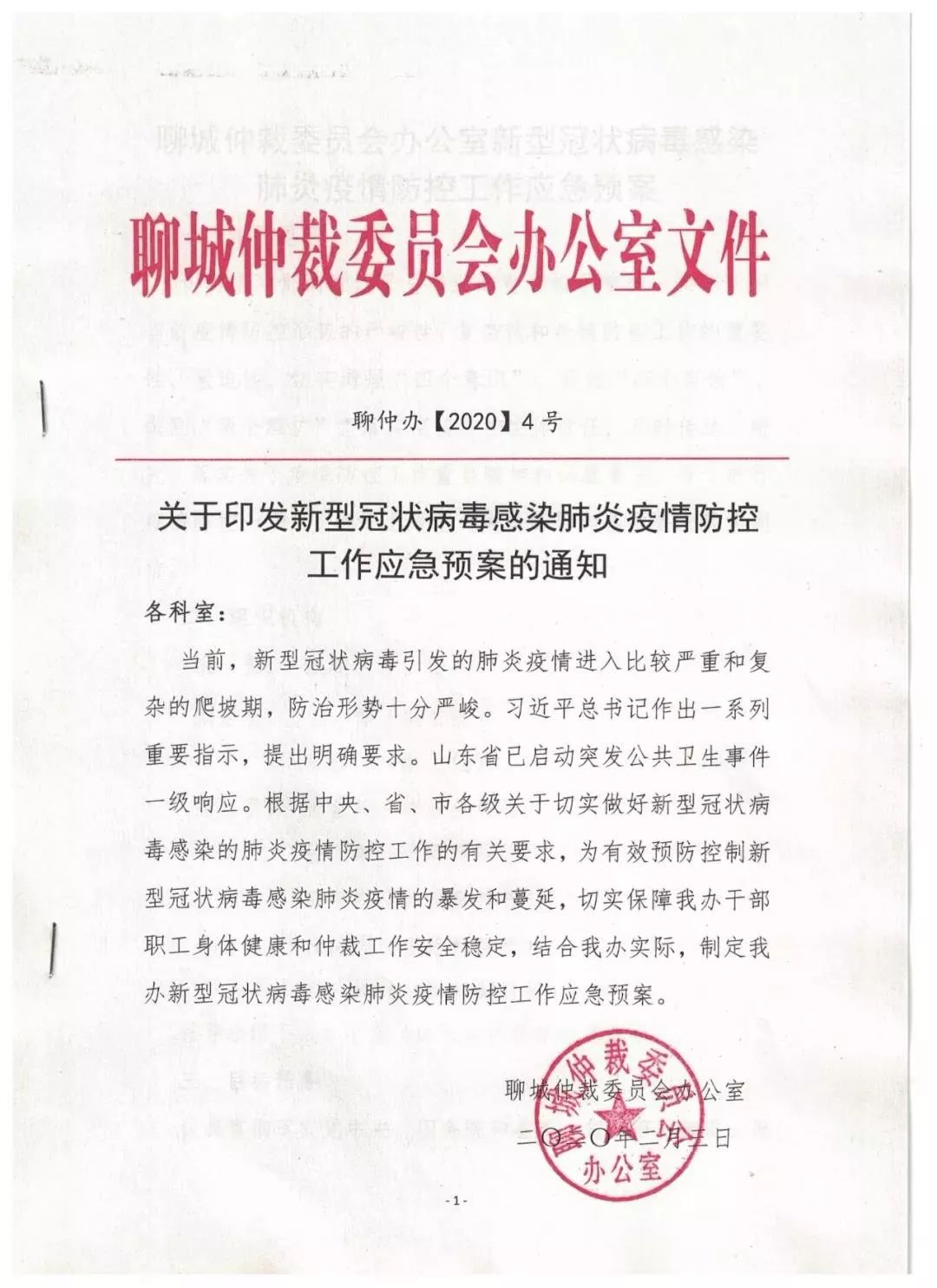 下发《关于印发新型冠状病毒感染肺炎疫情防控工作应急预案的通知》(聊仲办【2020】4号),根据应急预案,成立疫情防控小组,由仲裁办主任任组长,副主任任副组长。防控小组一并下发《仲裁办办公区出入管理制度》《仲裁办办公区防疫消杀管理制度》。