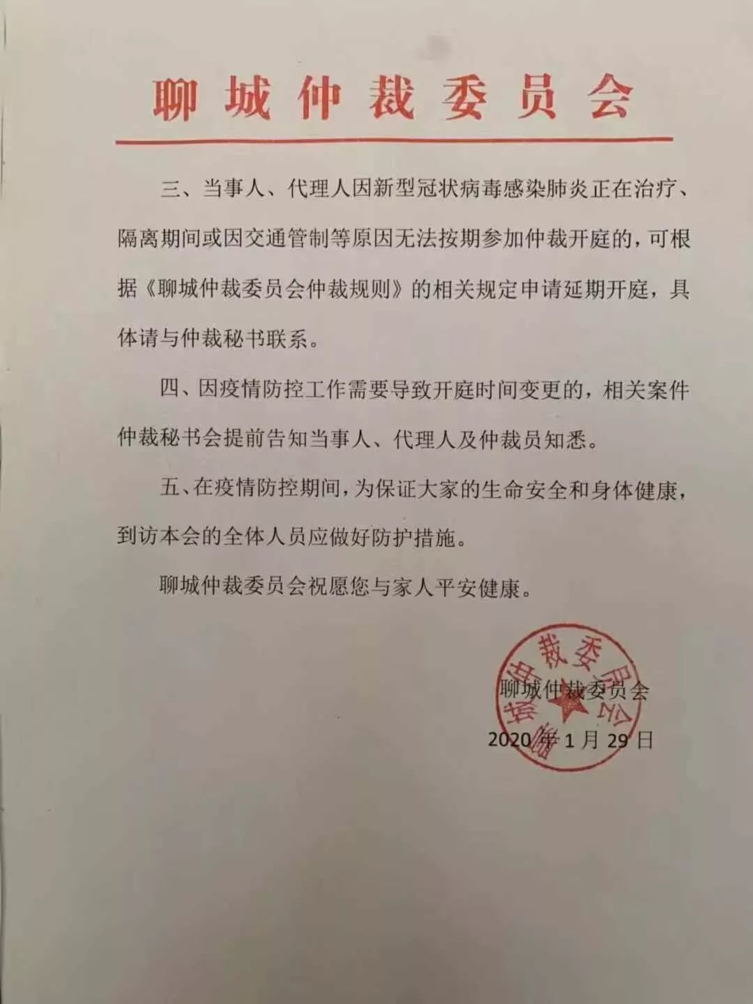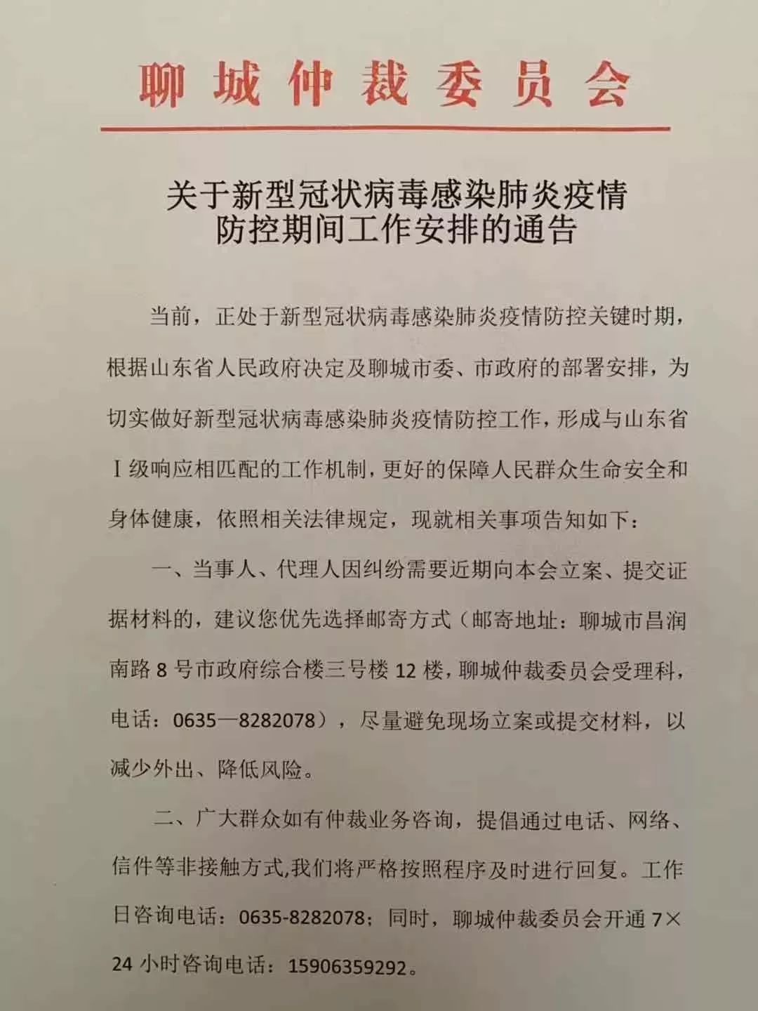 1月29日,在聊城仲裁委员会微信公众平台发布《聊城仲裁委员会关于新型冠状病毒感染肺炎疫情防控期间工作安排的通告》。对业务咨询、立案、提交材料、开庭等事项进行了通告。
