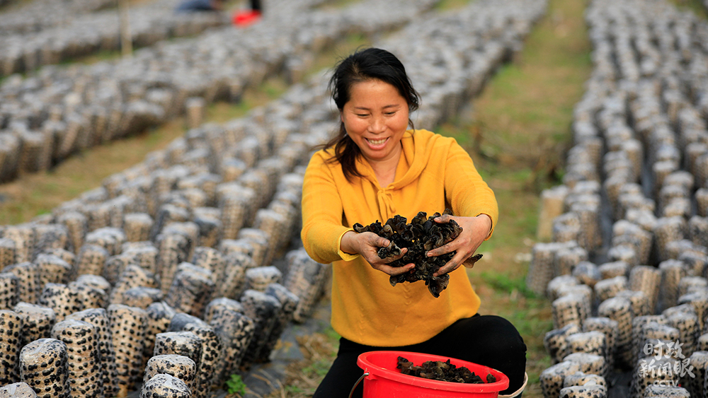 △2021年2月,贵州从江县贯洞村木耳扶贫基地,村民展示刚采摘的木耳。