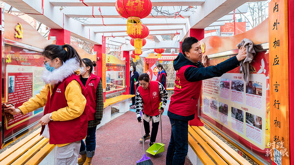 △2021年3月4日,内蒙古呼和浩特市玉泉区的党员干部、青年志愿者在清泉街社区党建文化长廊内打扫卫生。