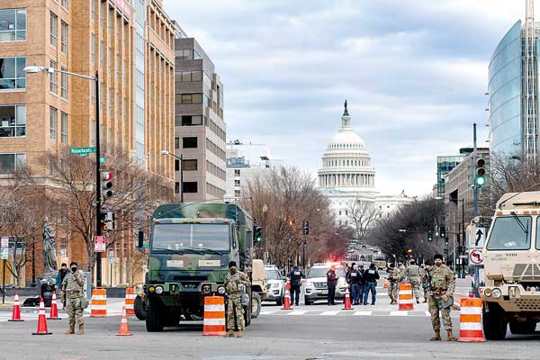 连日来,华盛顿特区处于高度警戒状态,安保日趋严密,堪比战区。国会大厦四周已竖起2米到3米多高的围栏,围栏内外有众多国民警卫队队员持枪巡逻。美国国防部已授权多达2.5万名国民警卫队队员协助总统就职典礼的安保工作,这一规模相当于美军目前在伊拉克和阿富汗驻军人数总和的5倍。