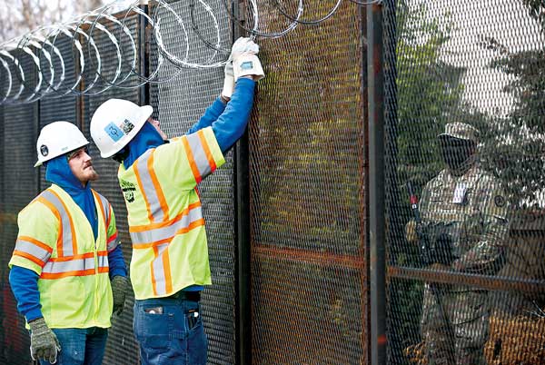 当地时间1月18日,美国华盛顿特区,工人在国会山附近安装铁丝网。(图片来源:人民视觉)