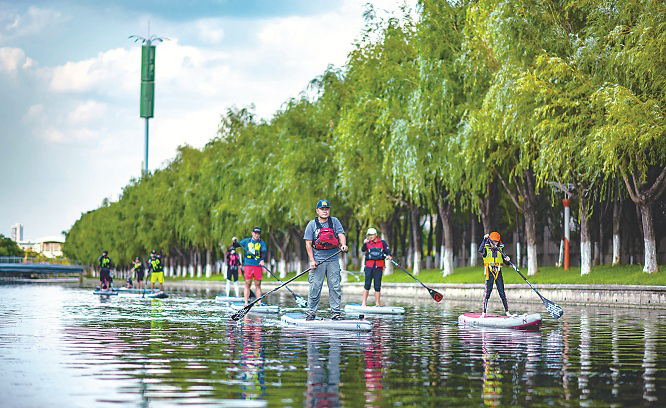 云南省近年来坚持生态优先、绿色发展,像保护眼睛一样保护生态环境,打造绿色产业,倡导绿色生活方式,建立了各类自然保护区超过160个,全省90%以上的典型生态系统得到有效保护。图为昆明市皮划艇爱好者在该市船房河竞技。新华社记者 江文耀 摄
