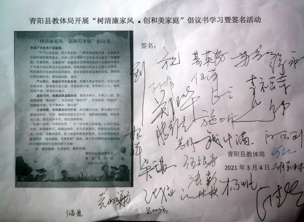图为县教体局机关集体学习家庭助廉倡仪书并组织党员干部开展签名承诺活动