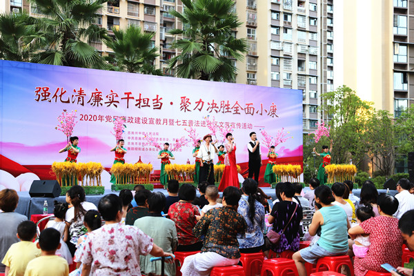 8月26日,在恩施市舞阳坝街道办事处金子坝村商会大厦小区,廉政歌曲《百姓爱那清廉的官》、恩施扬琴《扶贫路上》和诗朗诵《法、在我心中》等系列文艺节目精彩上演,为群众送上一道丰盛的廉政文化大餐。