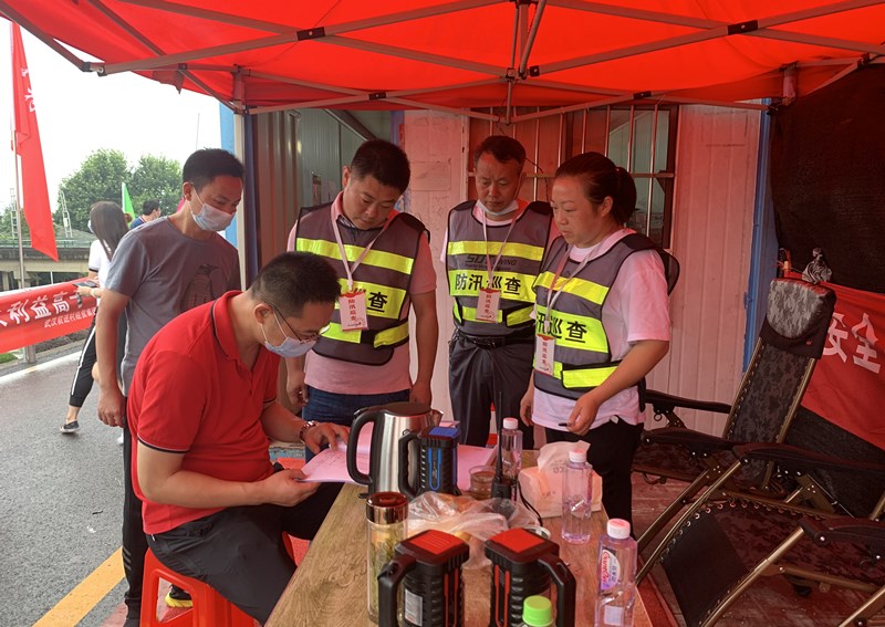 武汉市东西湖区慈惠街纪工委组织督查组赶往汉江干堤棉花码头闸口处查看水位,并对现场封堵情况进行监督检查。(徐庆摄)