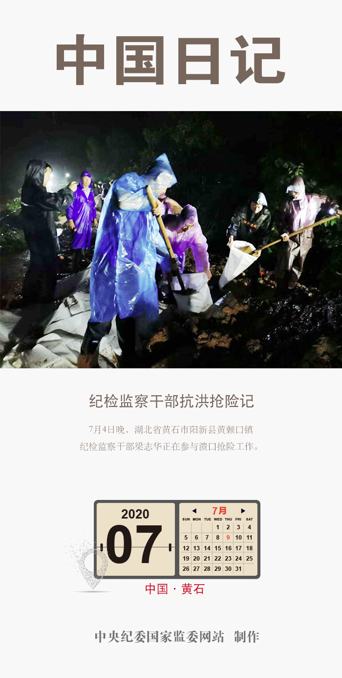 7月4日早7时,冒着倾盆大雨,湖北省黄石市阳新县黄颡口镇纪委书记梁志华和村干部们穿着雨靴、披着雨衣,手拿铁锹,正在凤凰村沙子垴水库和爱民港巡堤。
