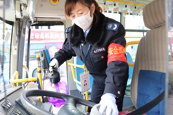 江苏省盱眙县公交公司的一群女司机主动组建“巾帼队伍”,每天利用休息时间,对公交车车厢进行内部消毒,确保不留死角,守护乘客的身体健康。(江苏省盱眙县纪委监委供 王小龙 摄)