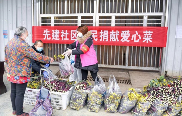 “现在是特殊时期,自己地里的菜臺吃不完,也卖不了,送给有需要的居民,能帮一点是一点。”武汉市洪山区洪山街先建社区志愿者蔡芝容从执勤卡点下班后,到自己菜地摘取了100斤新鲜菜,送到社区市场门口,供附近居民免费领取。(武汉市洪山区纪委监委供 蔡威 摄)