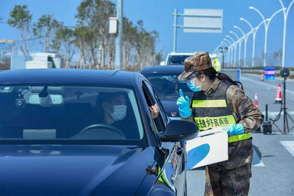 浙江省温州市洞头区洞头先锋女子民兵连的女民兵们,从1月底以来就一直值守在灵霓大堤东围堤路口,耐心细致地向往来车辆做着疫情防控和车辆劝导工作。(浙江省温州市洞头区纪委监委供 唐昭君 摄)