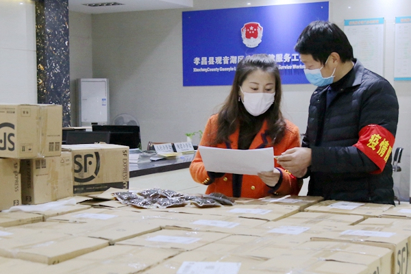 湖北省孝昌县观音湖区纪工委书记王婧(左一)坚守在疫情防控一线,对物资发放开展监督检查,提出监督建议,确保物资来源清、去向明。(湖北省孝昌县纪委监委供 胡玉平 摄)