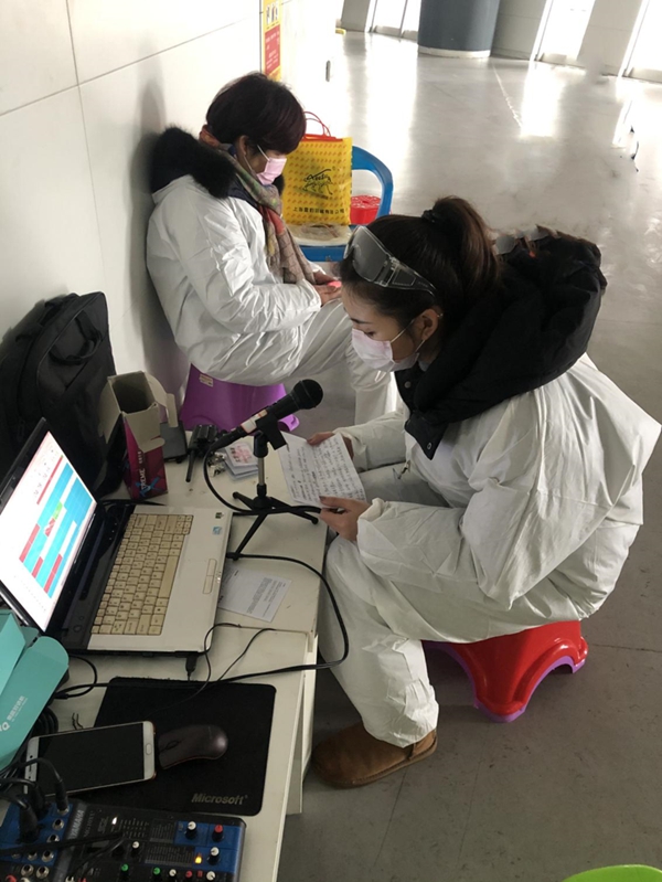 “亲爱的患者朋友们,下面为大家带来美文欣赏。”自2月14日起,武汉钢花小学90后音乐老师华雨辰就在武汉市青山区方舱医院当起了志愿者,开启了她方舱播音员的生活。每天早晨八点多钟,舱内广播都会准时响起。(武汉市青山区纪委监委供 李康 摄)