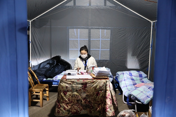 湖北省恩施州鹤峰县志愿者们白天参加物资配送,晚上轮流值守夜班,力争为疫情防控贡献更多力量。(湖北省鹤峰县纪委监委供 陈伟伟 摄)