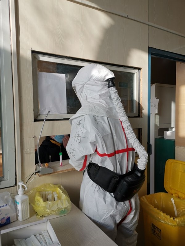 武汉市皮肤病防治院麻风防治中心护士长周倩洁,每天要去的是防控工作中最危险的岗位之一——随车到各隔离点采集咽拭子。在抗疫动员命令下达时,刚刚成为预备党员的她第一个报名。(武汉市纪委监委供 严莉丽 摄)