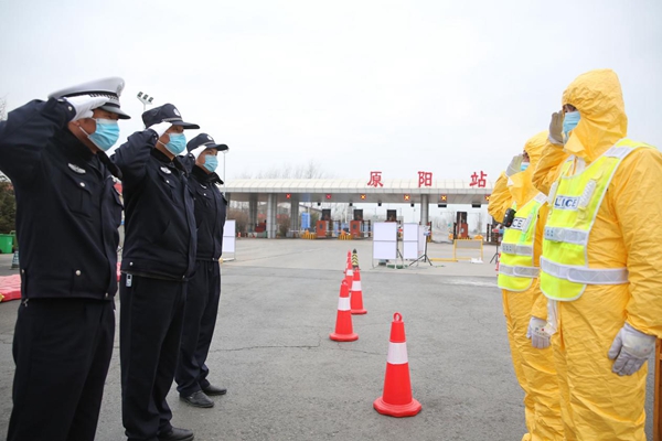 河南省原阳县高速口疫情防控卡点的警察同志正在交接工作。(河南省原阳县纪委监委供 高杰 摄)