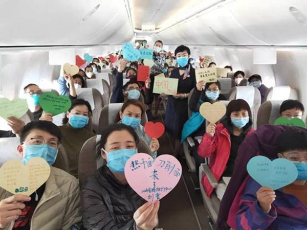 山西省第八批援鄂医疗队100名医务人员手举自制爱心打气卡片,为武汉加油,为湖北加油,为中国加油!截至目前,山西省已派出9批999名医疗队员支援湖北。(山西省纪委监委供 周涛 摄)