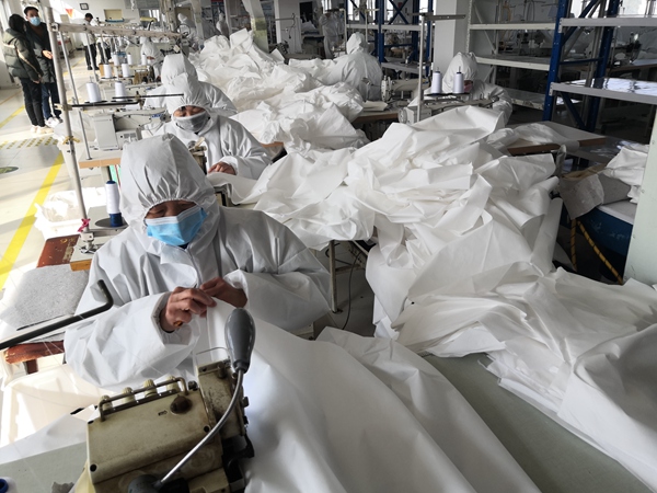 河南省洛阳市浩洋服饰有限公司因疫情防控需要,承担了转产医疗防护服和筹建医用口罩生产线的重任,工人们正在加班加点为一线“白衣战士”赶制医疗防护服。(河南省洛阳市洛龙区纪委监委供 刘营梅 摄)