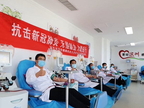 山东省邹平市卫生健康系统的医务志愿者参加义务献血,用实际行动缓解临床供血压力,为挽救患者生命和打赢疫情防控阻击战奉献医者仁心。(山东省邹平市纪委监委供 郭海涛 摄)
