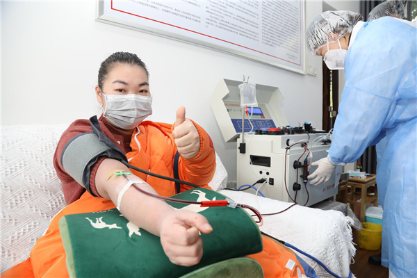 武汉市江夏区中医院护士袁黎,感染新冠肺炎后,经过16天的治疗,已经康复出院,她主动捐献血浆用于治疗新冠肺炎危重患者。(武汉市江夏区纪委监委供 吴芬 摄)