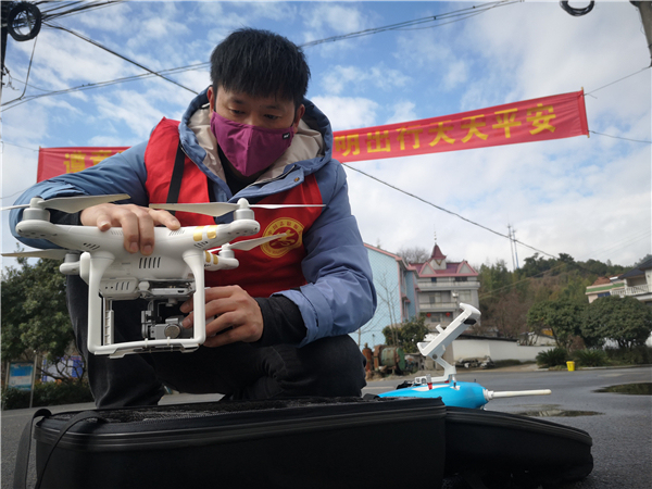 “发现村后江边小路有个村民没戴口罩!”疫情发生以来,浙江省桐庐县富春江镇上泗村小伙邹立明主动参加防疫志愿服务,他利用无人机每天开展巡查,通过不接触的形式检查村内道路、居家隔离人员住所、监督执勤等情况,扩大了巡查面。(浙江省桐庐县纪委监委供 徐达军 摄)