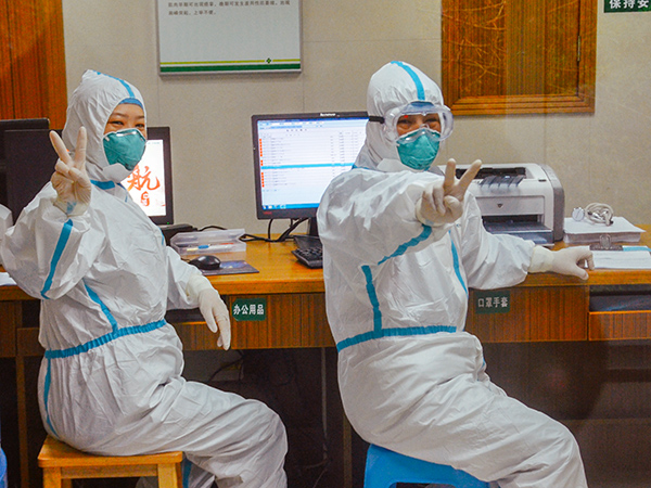 浙江省温州市第六人民医院感染科护士长仔细地帮助即将进入隔离区的同事做好防护,此时的无言胜过千言万语,每一个细致体贴的动作,都是对战友们安全归来的最真诚祝福。(浙江省温州市龙湾区纪委监委供 陈欢笑 摄)