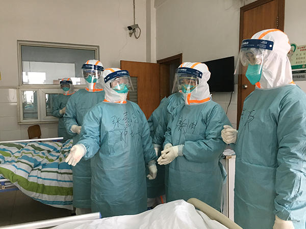 湖北省宜昌市第三人民医院隔离病区重症病房内,护士长向福建省对口支援宜昌医疗队介绍患者入院以来的情况。(湖北省宜昌市纪委监委供 龚梓 摄)