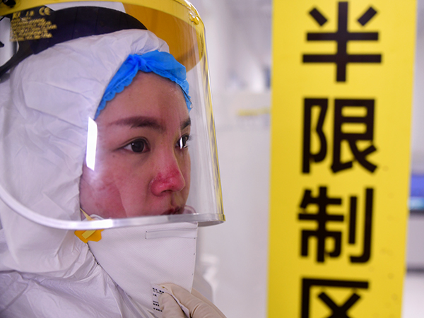 重庆市璧山区人民医院感染科90后护士匡艳,正在穿戴防护装备,准备进入隔离病房。连续奋战在抗疫一线的她,脸上满是被口罩勒出的伤痕。(重庆市璧山区纪委监委供 胡悦建 摄)