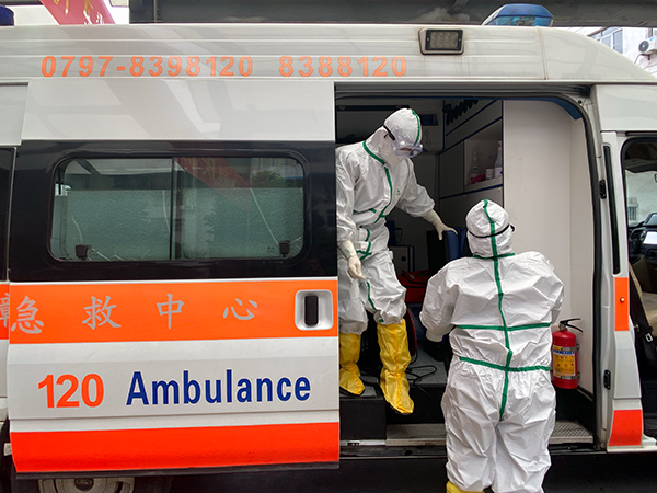 江西省赣州市立医院是当地新冠肺炎疑似病例的医学观察点,医护人员正准备将一名已确诊的患者转至传染病医院救治。(江西省赣州市章贡区纪委监委供 曾正东 摄)