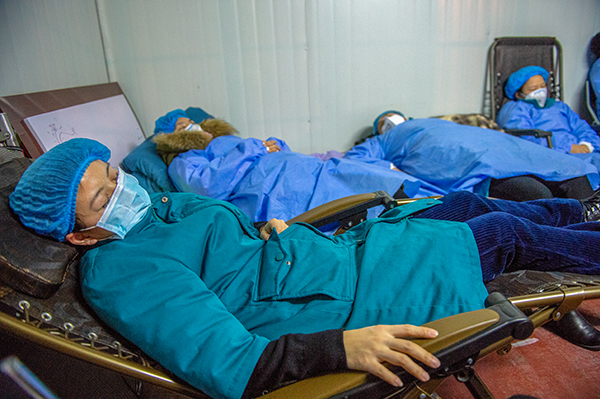 新冠肺炎疫情发生后,河南省郑州市中原区须水镇卫生院的医护人员投入到一线疫情防控工作中,争分夺秒忘我工作,行军床就是他们休息的地方。(河南省郑州市中原区纪委监委供 张亮 摄)