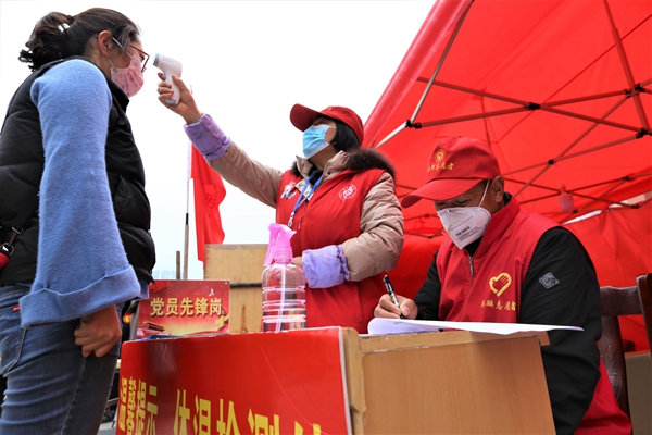 云南省曲靖市麒麟区建宁街道党员干部坚守社区防疫一线,每天为进出小区的群众提供测量体温、防疫知识宣传等服务。(云南省曲靖市麒麟区纪委监委供 罗白云 摄)