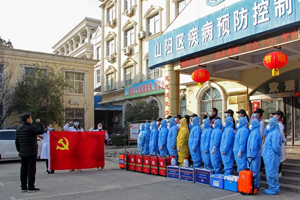 “我们自愿坚守在抗击新冠肺炎第一线,听党指挥,身先士卒……”河南省焦作市山阳区疾控中心全体党员干部在赶往疫情防控检测点前,整好装备,面向党旗庄严宣誓,全力投身抗击疫情阻击战。(河南省焦作市山阳区纪委监委供 张聪辉 摄)